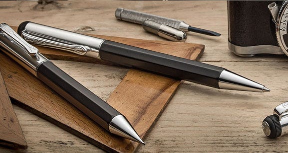 Kaweco ballpoint pens stand out from the crowd with their near silent push mechanism (which uses a special heart-curve), and the Sport range’s chunky hexagonal shape. Their premium collections are presented in a retro tin box, and all metal pens can be engraved. We stock Kaweco’s own ballpoint pen refills.